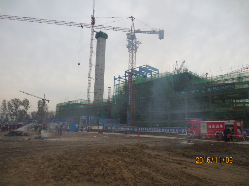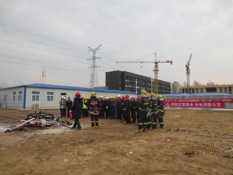 2016年“11.9”消防日当天下午,山东省单县垃圾焚烧发电厂项目各参建单位近100人联合山东省菏泽市单县消防大队,在厂区西北角空旷地面举行了一次大型消防演练,对施工现场的消防应急响应进行综合考验。整个消防演练生动连贯,达到了预期的消防教育效果。