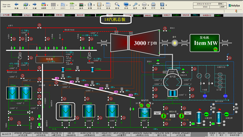 在整体的布局中,背景色经多种颜色反复试用后,最后选定柔和的深灰色。设备控制图标大都遵循横平竖直斜对齐(如图中白线所示)。液位柱状图与罐状设备示意图整体重合,选用渐变色显得设备更有真实感。每张界面的标题中心(如图中“1#汽机总貌”)严格规划在同一坐标位置,字体大小一致,切换画面时无漂移感。根据汽、水等不同的功能、特性,用不同的线径、线型和颜色来区分不同的线路。针对运营人员提出的视觉疲劳问题,在颜色的亮暗选择上也做了一定的考究。